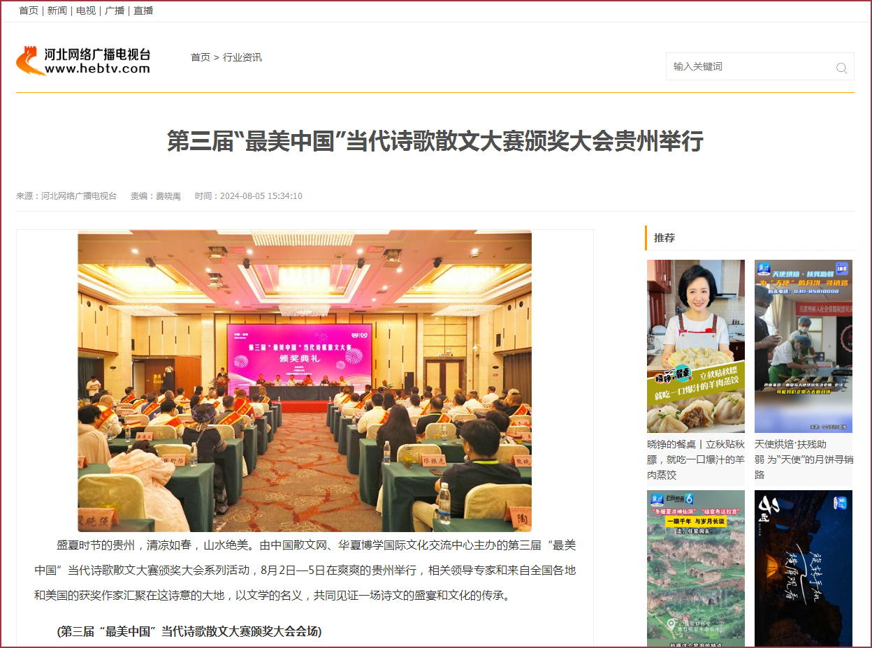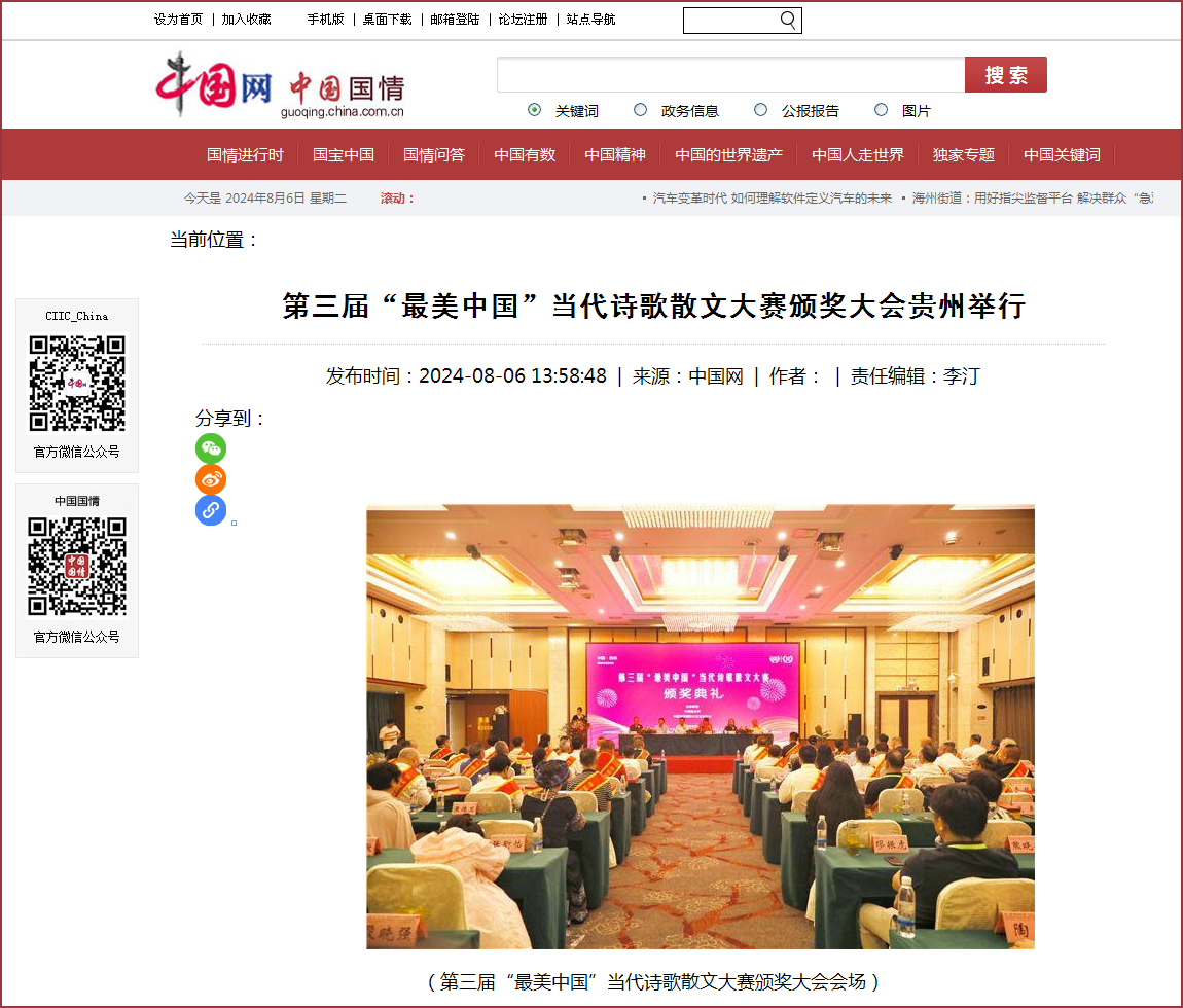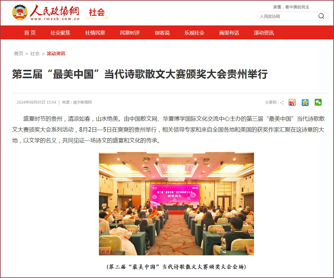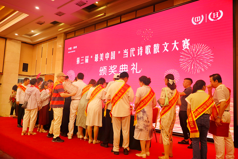 中国散文网讯: 盛夏时节的贵州,清凉如春,山水绝美。由中国散文网、华夏博学国际文化交流中心主办的第三届“最美中国”当代诗歌散文大赛颁奖大会系列活动,8月2日—5日在爽爽的贵州举行,相关领导专家和来自全国各地和美国的获奖作家汇聚在这诗意的大地,以文学的名义,共同见证一场诗文的盛宴和文化的传承。