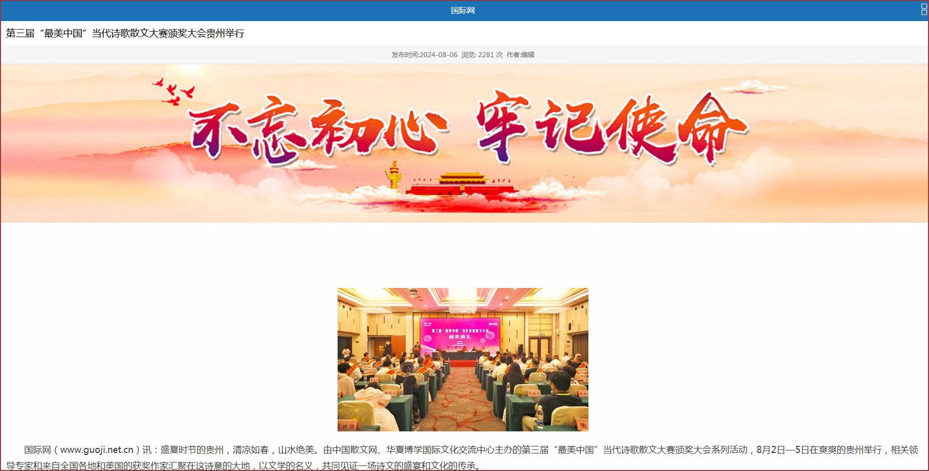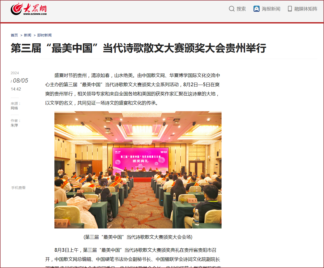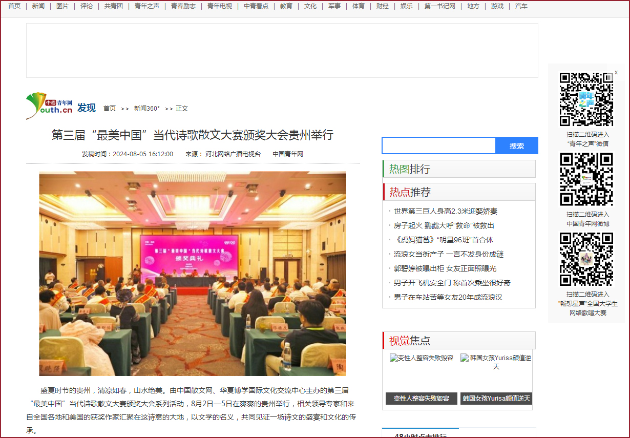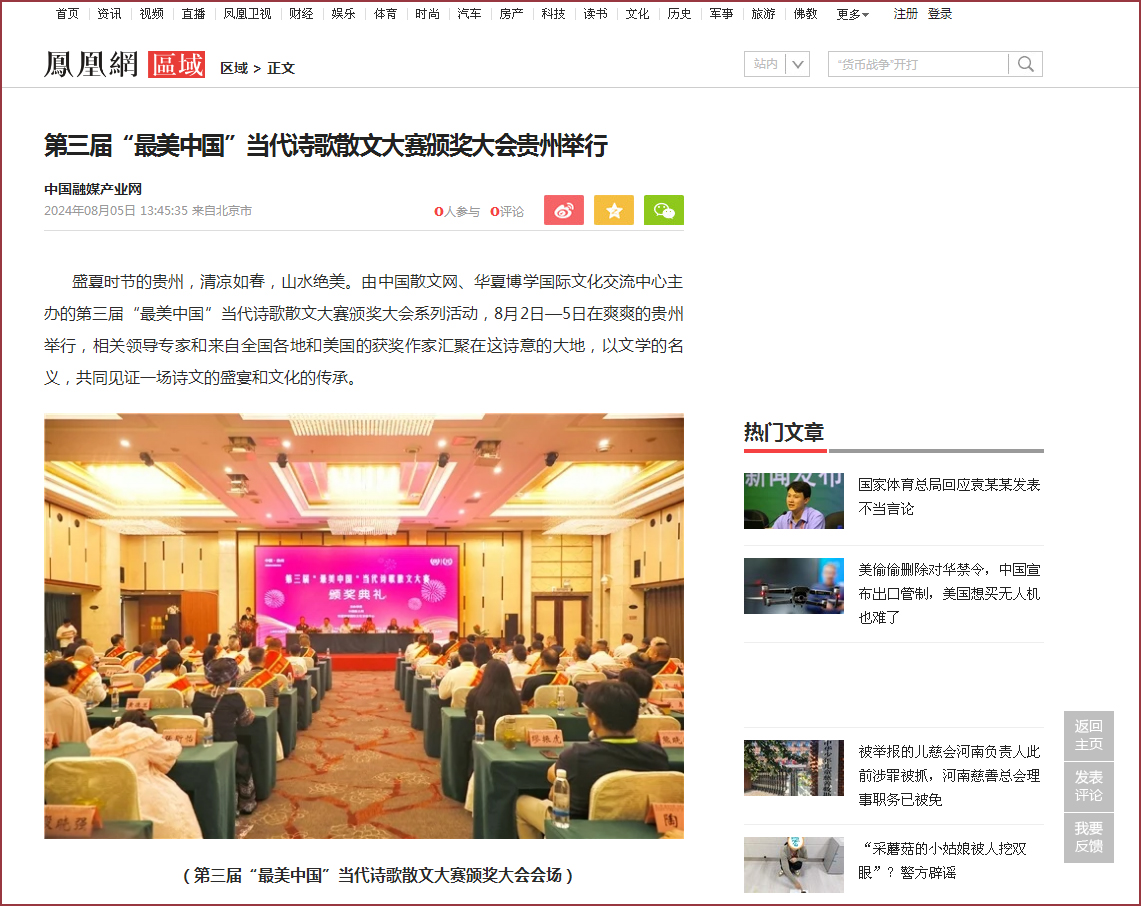 中国散文网讯: 盛夏时节的贵州,清凉如春,山水绝美。由中国散文网、华夏博学国际文化交流中心主办的第三届“最美中国”当代诗歌散文大赛颁奖大会系列活动,8月2日—5日在爽爽的贵州举行,相关领导专家和来自全国各地和美国的获奖作家汇聚在这诗意的大地,以文学的名义,共同见证一场诗文的盛宴和文化的传承。