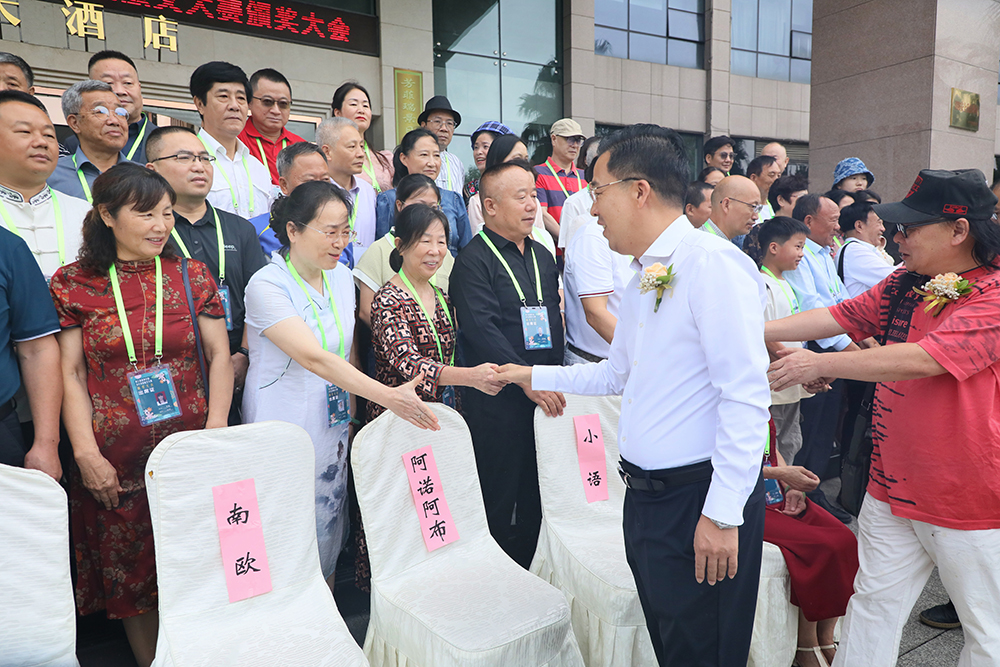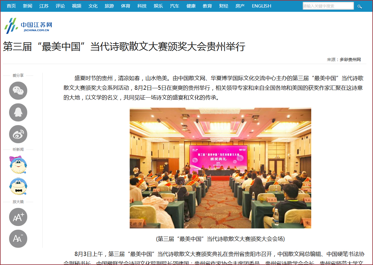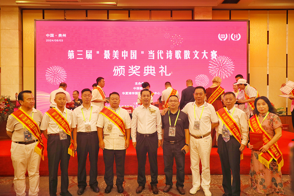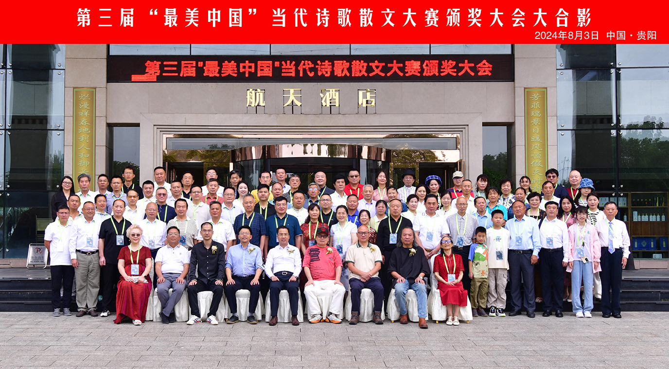 8月3日上午,第三届“最美中国”当代诗歌散文大赛颁奖典礼在贵州省贵阳市召开,中国散文网总编辑、中国硬笔书法协会副秘书长、中国楹联学会诗词文化院副院长邵建国;贵州省作家协会主席团委员、贵州省诗歌学会会长、贵州省师范大学文学院客座教授南鸥;贵州大学副教授、硕士生导师、贵州大学哲学研究所副所长、文学博士胡嘉明;世界诗人大会中国办事处副主任、中国彝族文化学者、《大西南月刊》原主编阿诺阿布;贵州大学副教授、北京师范大学中国现当代文学博士、贵州省文艺评论家协会副主席朱永富;贵州散文学会原副会长、贵州省作协理事小语和贵州省布依族学会副秘书长、贵州省龙里县委宣传部原常务副部长、县文联主席罗士朝等领导专家出席颁奖大会。会前,与会领导专家亲切接见中外获奖作家,并合影留念。