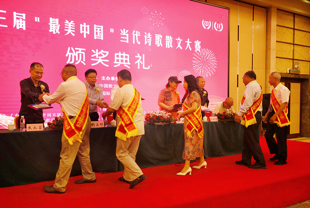 在欢快的音乐声中,荣获一、二、三等奖的中外获奖作家一一上台领奖,与会领导专家为他们颁发了奖牌和证书。在大赛颁奖大会上,根据综合创作成绩,优中选优,评出十位最佳诗歌奖:薛绍财、史天斌、刘应尧、李明光、程兆洪、靳建宁、刘成海、杨娟、余家瑄、冉文寿;十位最佳散文奖:张仁双、周千山、张长龙、杨紫英、李鹏飞、马超、胡根源、单德菊、赖维斌、段昌明,大会向获奖诗人作家颁发了荣誉证书。与会领导专家先后致辞,祝贺颁奖大会召开,祝贺获奖的作家。美国的获奖作家杨紫英、四川省的获奖作家靳建宁代表海内外获奖作家上台发言,和大家一起分享了获奖的喜悦:感谢组委会精心组织和搭建的交流平台,共享创作成果的喜悦和欢乐,这是光荣的时刻,幸福的时光,远方的回响。这次颁奖活动对于我们广大获奖者来说,更是一种激励和鼓舞,让我们展露才华放歌中华!
