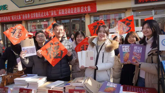 活动深入郭店大集,设置了文学书刊展、书画展、非遗展等展位。《山东文学》《时代文学》《百家评论》《当代小说》和山东人民出版社编辑,以及作家王玉珏、李恒昌、刘君、苏雨景等现场推介书刊,并向郭店街道办事处和大集上的摊主和群众赠送《山东文学》《时代文学》《百家评论》《当代小说》《山东作家作品年选》《大河涅槃》《另一种雪》《向阳坡上》《假面先锋》等百余种文学精品书刊;书画展位上,盛洪义、翟圣亮、常猛三位书法家现场挥毫泼墨,为群众手写春联送祝福;在非遗展位,张鸿福向群众介绍了年画、剪纸、糖画、面塑、泥塑等省级非物质文化遗产;活动现场还设置了文学常识趣味问答环节,期刊编辑与群众进行文学互动。