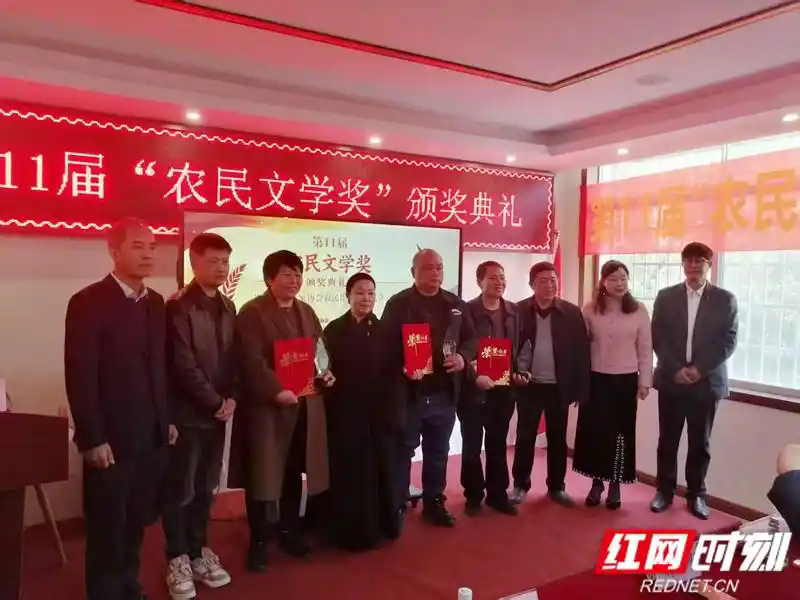4月2日,以“传播农村好声音,讲好农民故事,培育农村文化氛围,助力乡村文化振兴与建设和美乡村”为宗旨的第11届“农民文学奖”在湖南永州颁发,曾登上2024央视网络春晚并赴联合国演讲的“田埂上的写诗者”、河南南阳54岁农妇韩仕梅,永州本土农民作家王一武、来自岳阳湘阴的“外卖诗人”王顶等3位农民作家获奖。本次颁奖活动由永州市作家协会主席吴茂盛主持,出生于永州东安县农村的中国女书文化推广大使、中国歌剧舞剧院青年歌唱家李雨儿与永州市文联二级巡视员刘翼平、湖南潇湘经济促进会会长刘飞、“农民文学奖”发起人张一一一起为获奖农民作家颁奖,并现场即兴演唱了永州市旅游形象主题歌曲《走,去永州》。