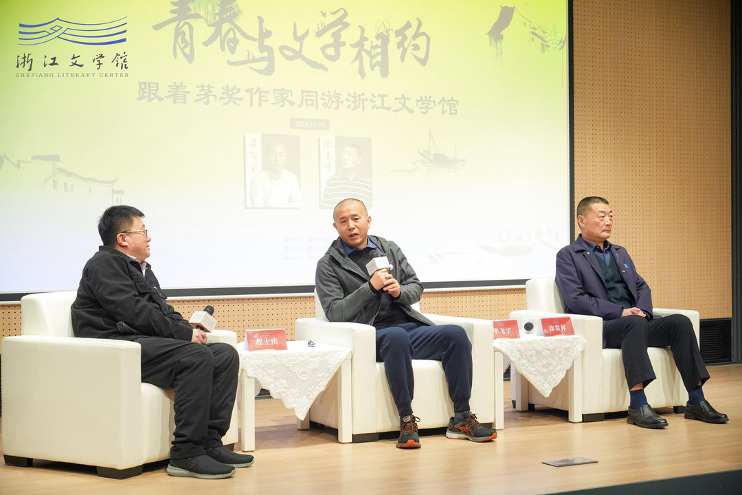 “青春与文学相约——跟着茅奖作家同游浙江文学馆”是本届茅盾文学周的首发活动,著名作家毕飞宇、徐贵祥来到浙江文学馆,和学生们一起分享有关文学的故事、交流有关文学的看法。