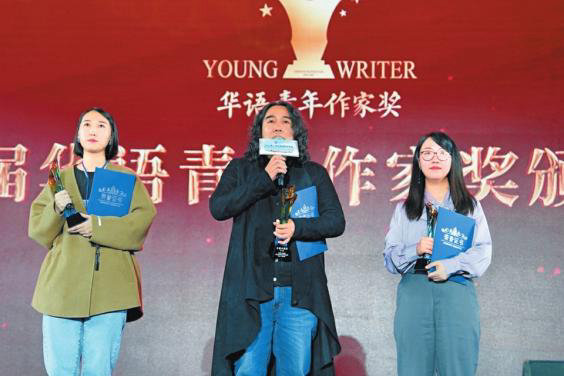顾拜妮、包倬、龚万莹(从左至右)领取第九届华语青年作家奖“中篇小说奖”
