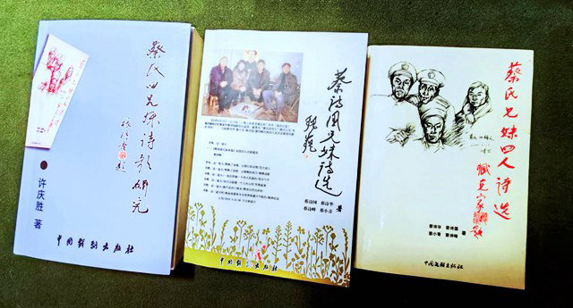 附②图说:蔡诗国兄妹四人先后出版了《蔡氏兄妹四人诗选》《蔡诗国兄妹诗选》(蔡诗国/蔡诗华/蔡诗峰/蔡小青 著)等诗选、许庆胜用十年的时间撰写的《蔡氏四兄妹诗歌研究》评论专著。