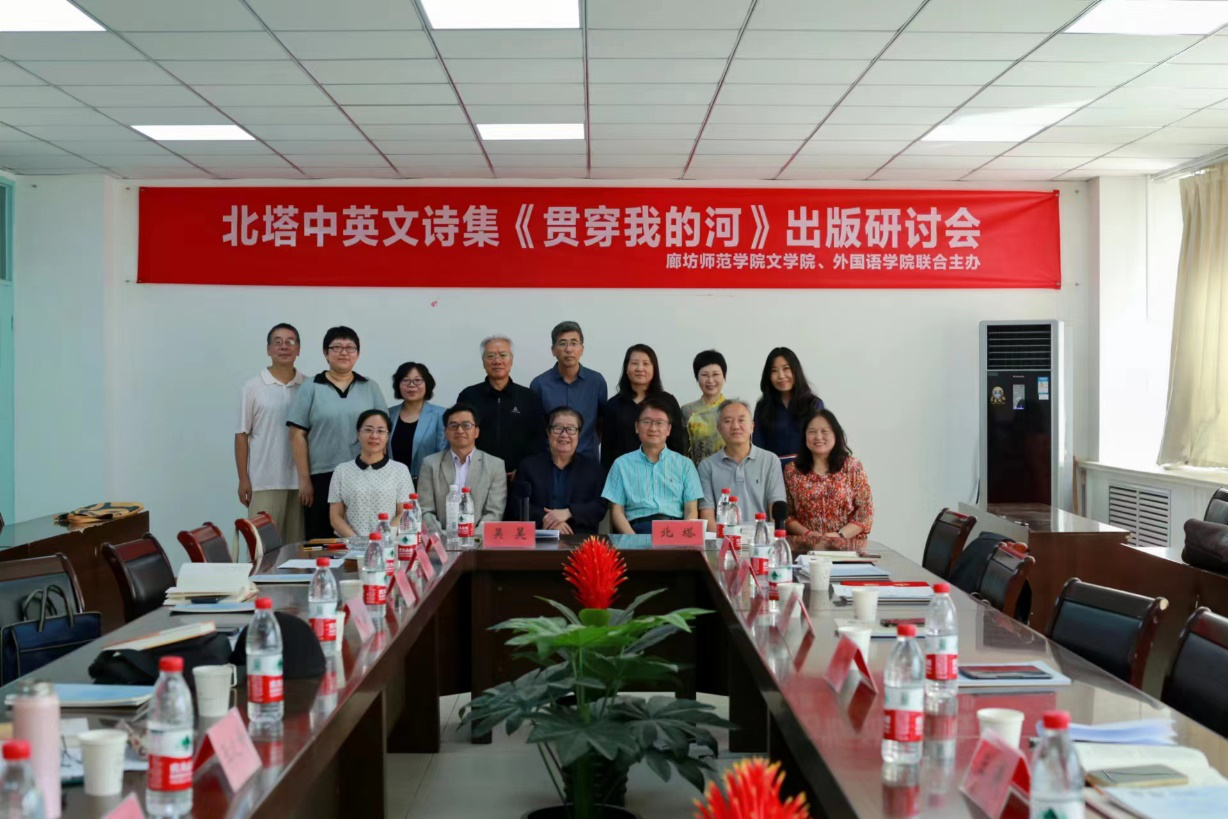 2023年9月14日上午,北塔中英文诗集《贯穿我的河》出版研讨会在廊坊师范学院人文楼会议室顺利举行。本次研讨会由廊坊师范学院文学院和外国语学院联合主办,由文学院教师吴昊博士主持,特邀著名诗歌理论家苗雨时教授参会。文学院党委书记苏晓梅,外国语学院副院长张庆红,作家网总编辑赵智,中国人民大学外国语学院朱源教授,《语文教学之友》主编许振东教授、文学院王宁教授,外国语学院张秀梅教授,外国语学院王燕教授,外国语学院副教授、诗人云海英女士,廊坊市作家协会副主席、诗人王克金先生,中国自然作家协会副主席、诗人郭友钊,北华航天工业学院宣传部副部长、诗人刘涛先生,诗人王之峰先生等近30人参加本次研讨会。