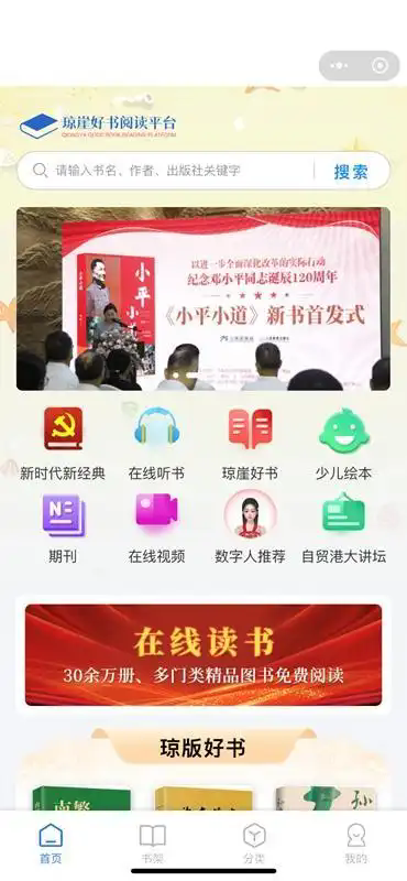 “琼崖好书阅读平台”由海南省委宣传部指导,海南省出版发行集团牵头建设、北京中文在线阅读公司承建。据海南凤凰新华出版发行有限责任公司宣传部主任雷志介绍,所有用户均可通过微信小程序直接登录访问,无需额外下载安装,手机、电脑等多端口均可访问,便捷实现“处处可读、时时能读”,致力于让优质阅读资源触手可及,覆盖城乡各个角落。