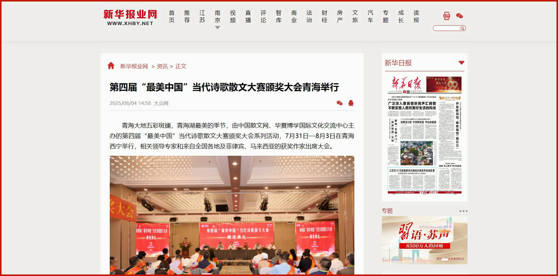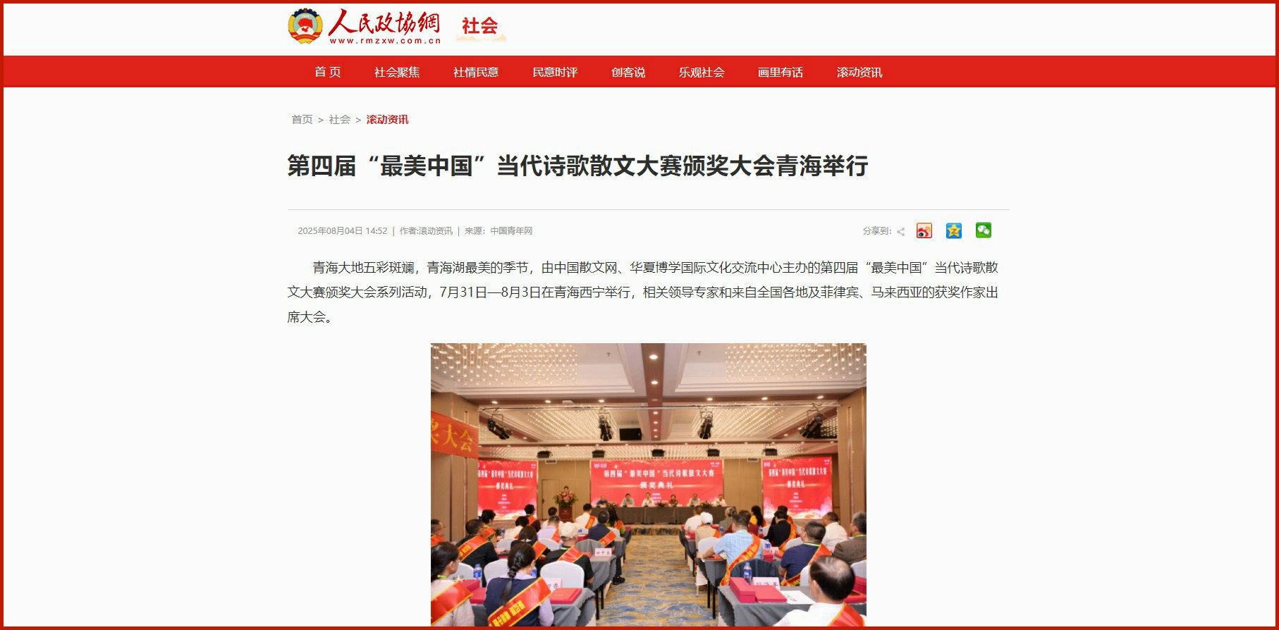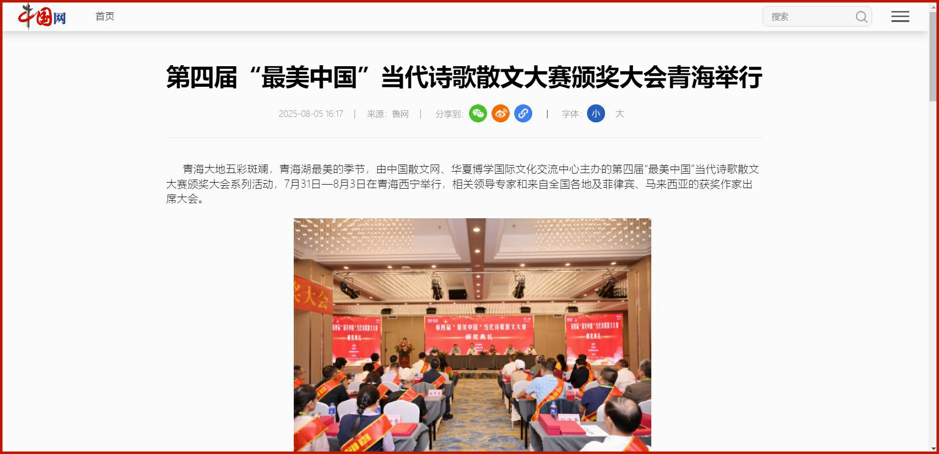 中国散文网讯:青海大地五彩斑斓,青海湖最美的季节,由中国散文网、华夏博学国际文化交流中心主办的第四届“最美中国”当代诗歌散文大赛颁奖大会系列活动,7月31日—8月3日在青海西宁举行,相关领导专家和来自全国各地及菲律宾、马来西亚的获奖作家出席大会。