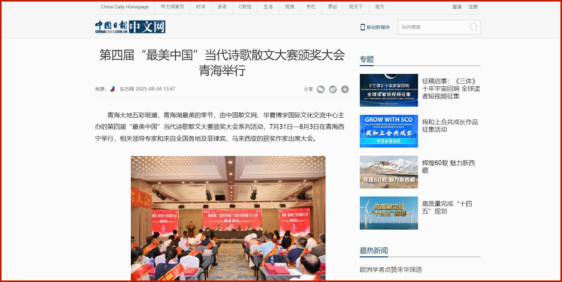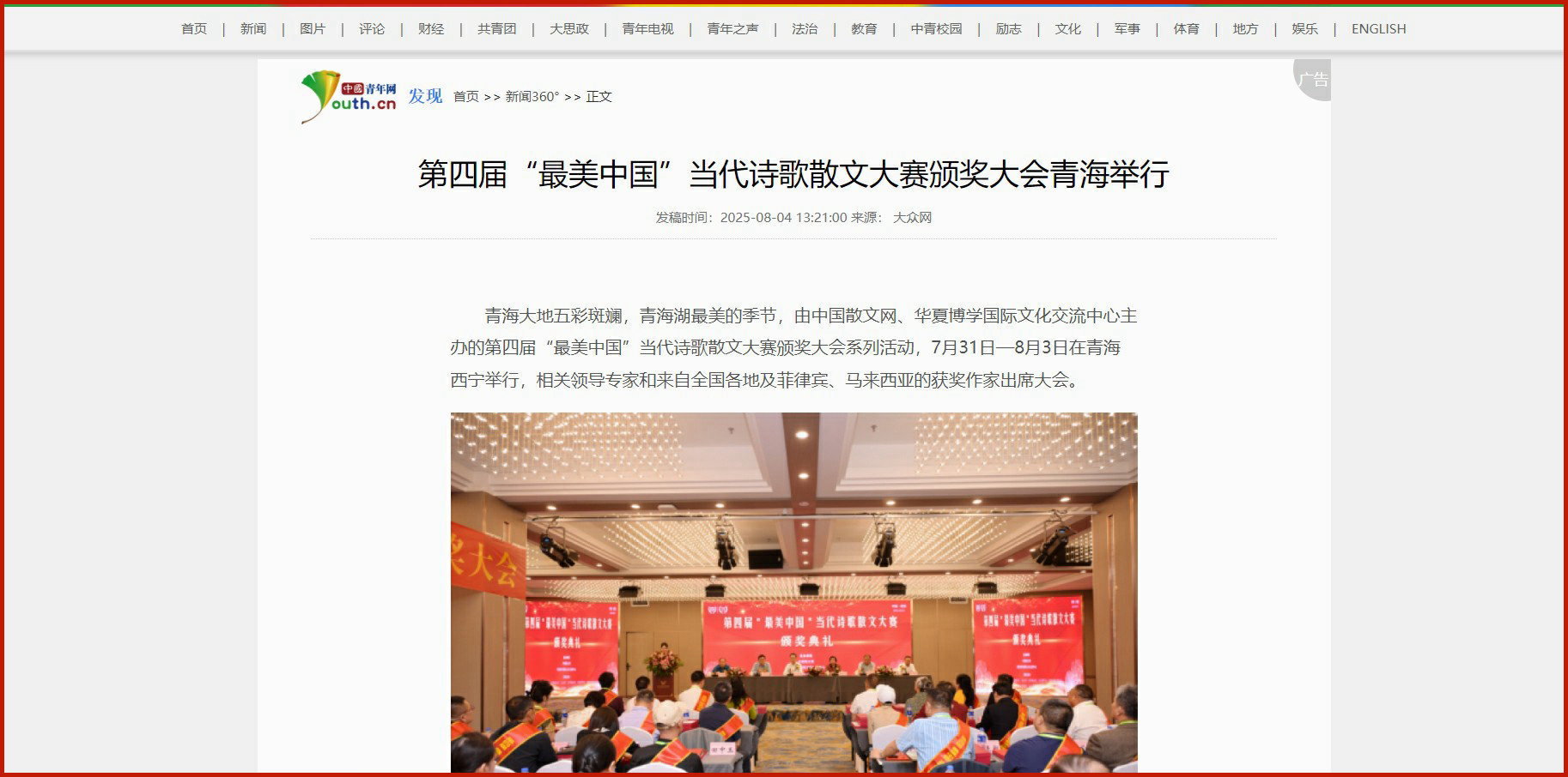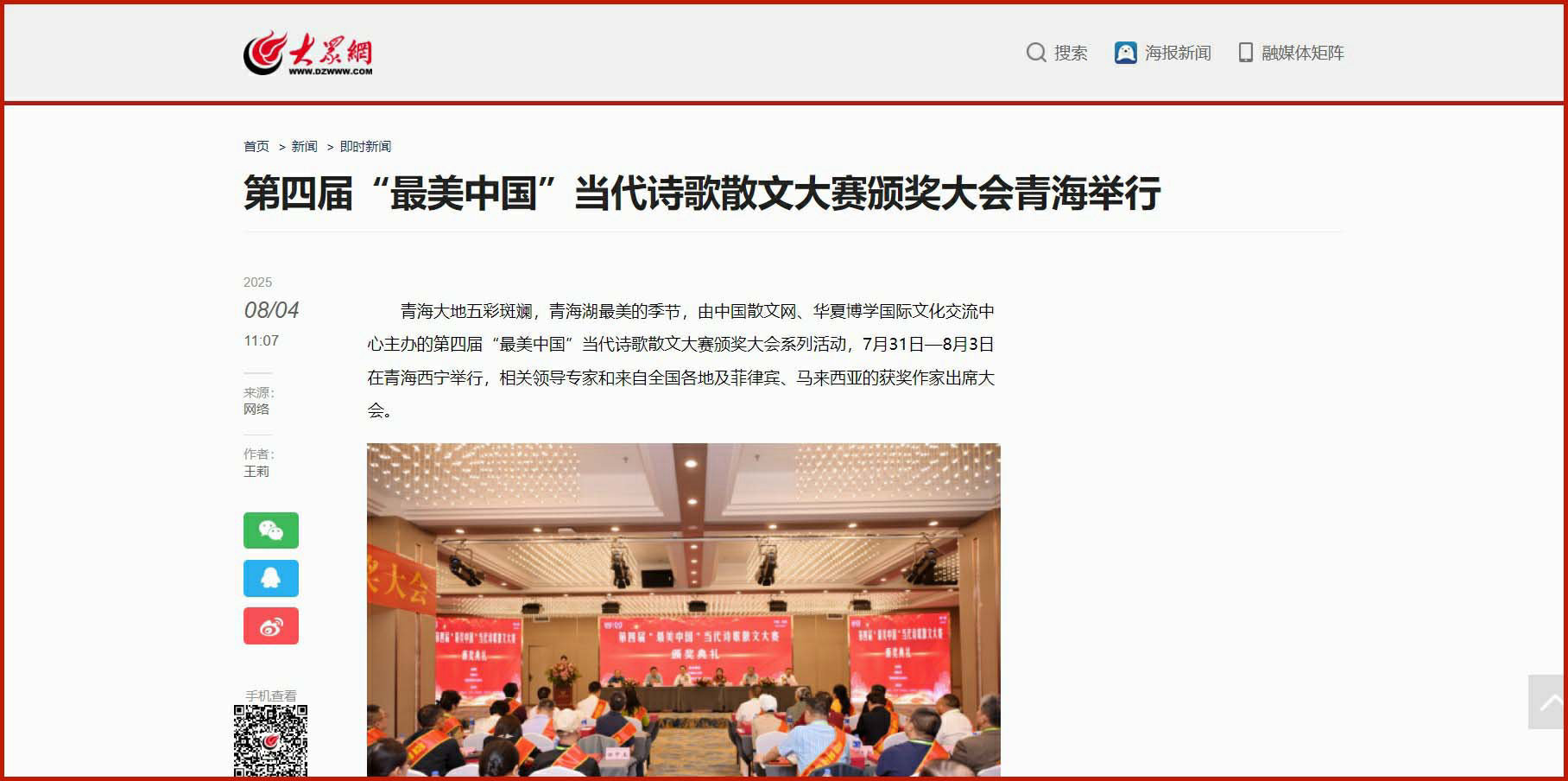 第四届“最美中国”当代诗歌散文大赛颁奖大会受到中央和省级媒体人民政协网、中国日报网、中国青年网、中国网、新华报业网、大众网、鲁网、今日头条、都市头条、抖音、快手等广泛关注,全网发布相关资讯近百条。